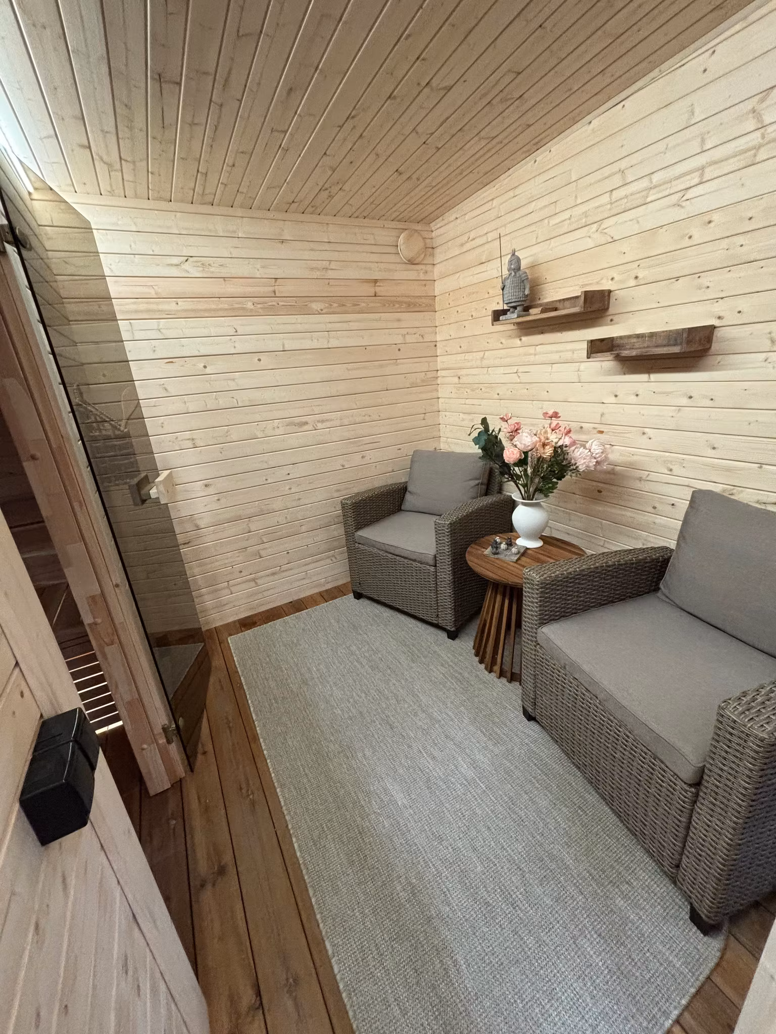 Bastudelen är 200x225 cm cm och erbjuder en bekväm sitthöjd för 3-4 personer. Relax- och omklädningsrummet är 187x225 cm, vilket ger gott om utrymme för avkoppling efter bastubadet.
