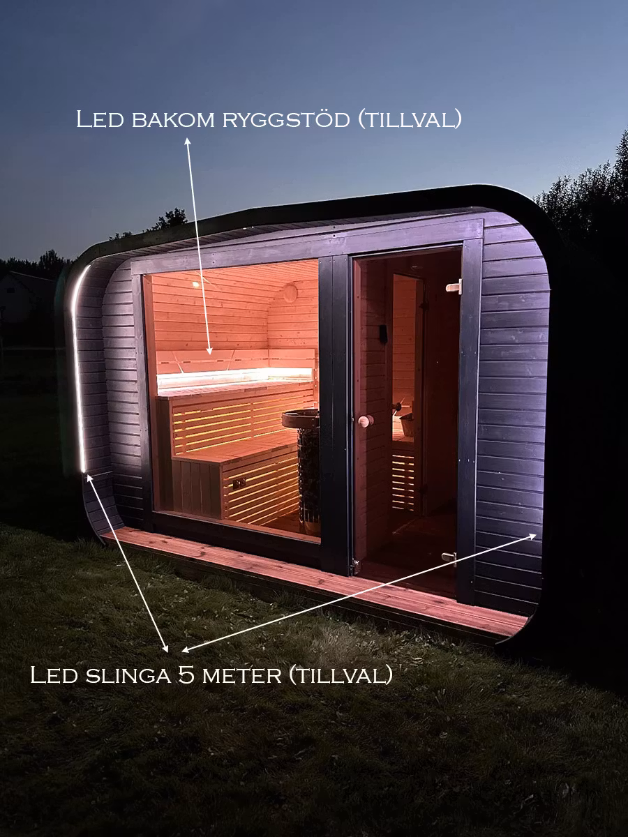 Dold LED-belysning (220V) under sittplatserna skapar en behaglig och mysig atmosfär i bastun, medan relaxdelen har en LED-lampa i taket för ljus.