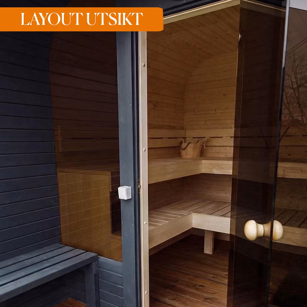 Bastun har en terrass för avkylnings- och avkopplingssessioner utomhus. Terrassen ger en extra dimension till bastuupplevelsen och är perfekt för att njuta av frisk luft efter bastubadet. Panoramafönster på hela framsidan av 6 mm härdat och tonat glas. Ytterdörren är en glasdörr med träram och ett säkert lås.